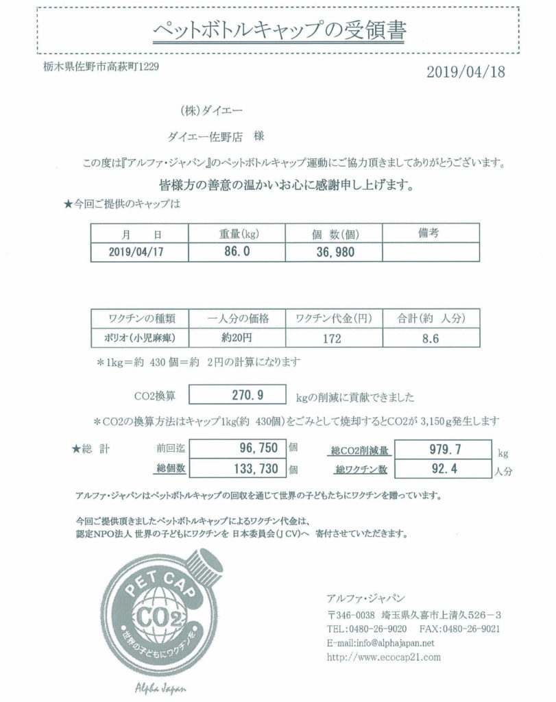 先日、ダイエー佐野店にて回収したペットボトルキャップ86kgを回収業者様へ