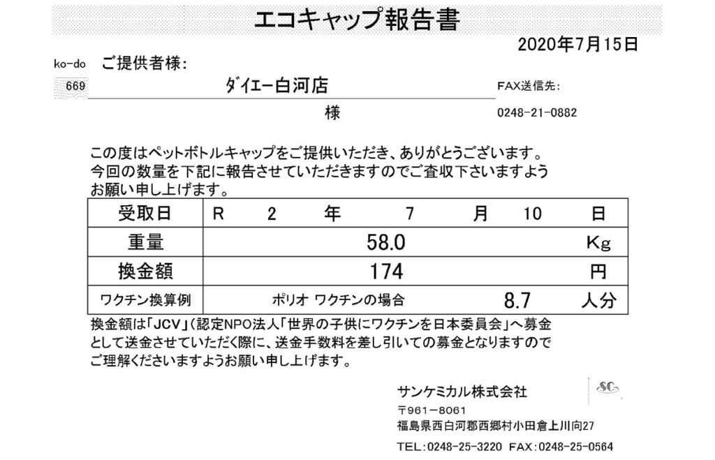 先日、ダイエー白河店にて回収したペットボトルキャップ58kgを回収業者様へお渡しし、累計回収量は2,071,590個となりました。